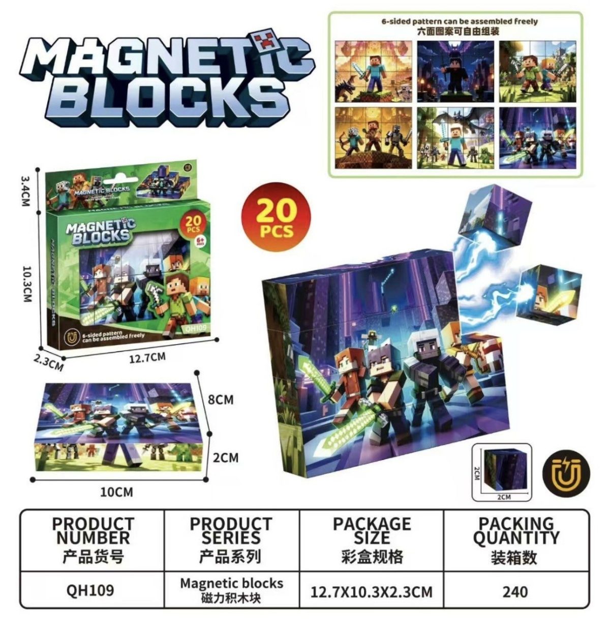 Rozmiar/ Kolor: KLOCKI MAGNETYCZNE BLOKI MINECRAFT 20PCS