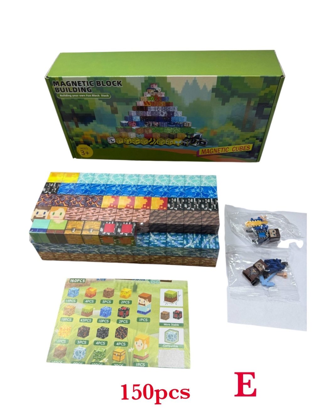 Rozmiar/ Kolor: KLOCKI MAGNETYCZNE E 150PCS KLOCKÓW KONSTRUKCYJNE PIKSELE SZEŚCIANY + 2 LUDZIK